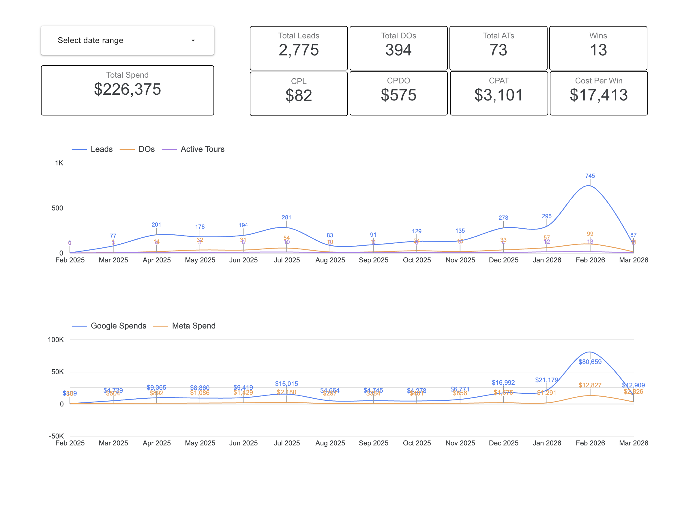 This mart model joins Google and Meta daily spend with CRM funnel stages (Leads → DOs → Active Tours → Wins) to give a unified cross-channel view for each day.