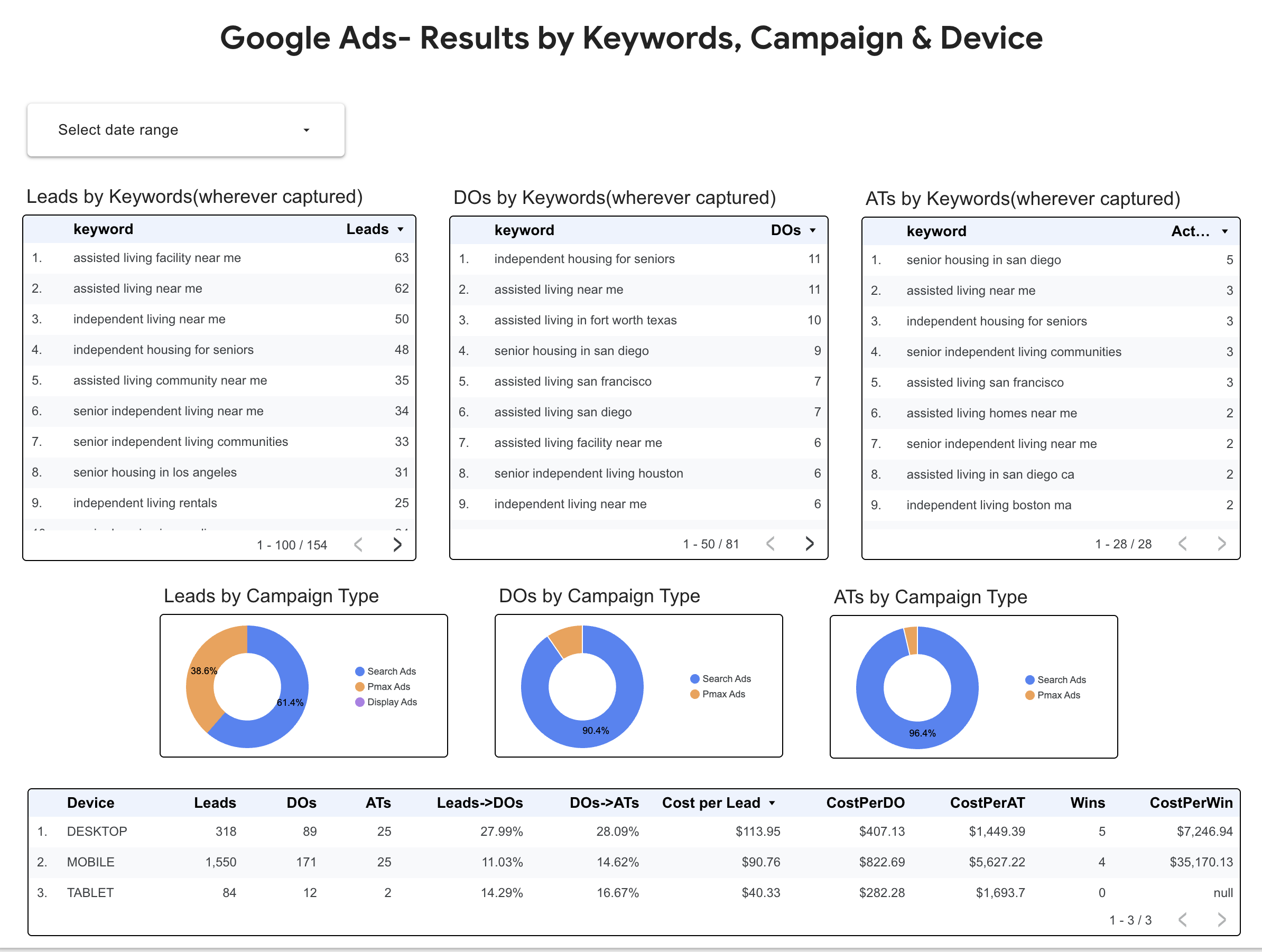 Breaks down impressions, clicks, spend, and full funnel metrics (Leads → DOs → ATs → Wins) by device type — used to drive device-level bid strategy.